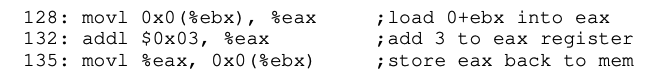 ebx에 저장되어 있는 x의 주소를 movl 명령어를 통해 exa에 넣는다. eax 레지스터에 3을 더하고 exa의 값을 같은 위치의 메모리에 저장한다. 그러면 프로세스 관점에서는 아래와 같은 메모리 접근이 일어난다.