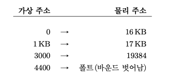 - 가상 주소가 3000일 때는 가상 주소 3000에 베이스 주소 16KB(16KB * 1024 = 16,384)를 더해 19,384가 되었다.