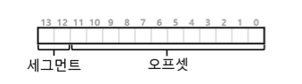 코드, 스택, 힙 3개의 세그멘트로 구분해야 한다고 해보자. 주소 공간을 3개의 세그멘트로 나누려면 2비트가 필요하므로 가상 주소 14비트 중 최상위 2비트를 사용한다. 그리고 나머지 12비트는 오프셋으로 사용한다. 오프셋은 세그멘트 시작 주소로부터의 거리를 말하는데, 오프셋으로 사용할 수 있는 비트가 12비트이므로 하나의 세그멘트가 가질 수 있는 최대 공간은 4KB(2^2 * 2^10)이다.