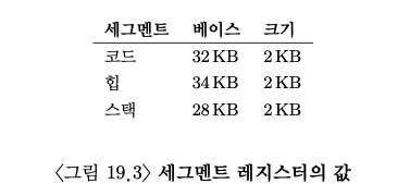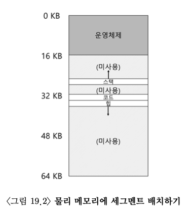 그림 19.1에서 가상 주소 4200의 힙을 살펴보자. 가상 주소 4200을 힙의 베이스 34KB에 더하면 물리주소 39016을 얻는데, 이는 올바른 물리 주소가 아니다. 먼저 힙 안에서의 오프셋, 즉 주소가 참조하는 바이트가 이 세그멘트 시작으로부터 몇 번째 바이트인지를 얻어야 한다. 힙은 가상주소 4KB에서부터 시작하기 때문에 오프셋 4200은 실제로는 4200-4096 = 104가 된다. 이 오프셋 104를 베이스 레지스터의 물리주소 34KB에 더해 물리 주소 34920을 얻을 수 있다.