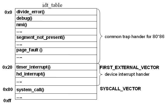 참고로 OStep교재에서는 이 과정을 트랩 테이블(trap-table)과 트랩 핸들러(trap-handler) 정도로 간단히 짚고 넘어가는 것 같다. 커널이 부팅할 때 트랩 테이블을 만들고, 트랩 테이블에는 트랩 핸들러가 정의되어 있다. 그래서 만약 fork()라는 시스템 콜을 호출하면 이 시스템 콜에 해당하는 트랩 테이블의 칸으로 가서 트랩 핸들러의 주소를 알아낸다. 그리고 이 주소로 분기한다.