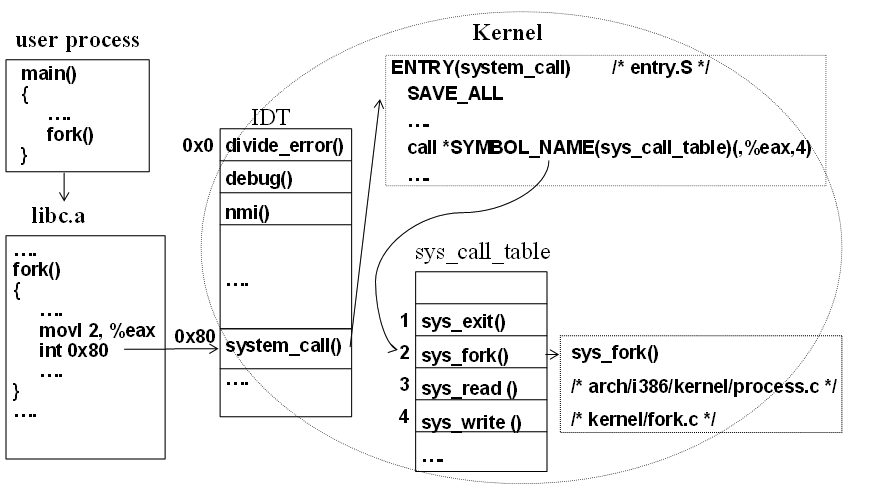 리눅스 내에서 시스템 콜이 발생하면 진행되는 흐름은 다음과 같다. 사용자 프로세스libc.a아규먼트 스택에 넣음시스템 콜 번호 저장트랩(trap) 발생system_call()IDT에 의해 트랩을 시작진짜 핸들러
