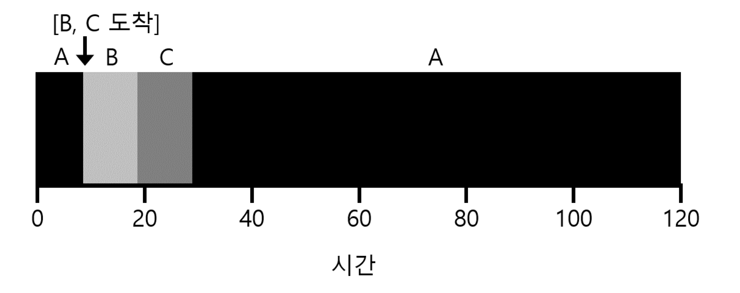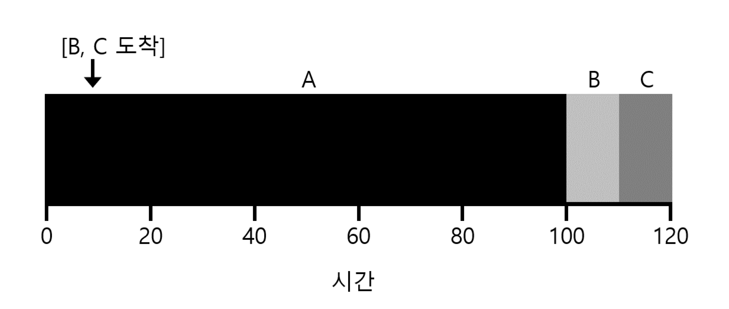 t=0에 도착하고 100초 동안 실행되는 A, t=10에 도착하고 10초 동안 실행되는 B, C를 SJF 스케줄링으로 실행시킨다고 하자. 이 작업들의 평균 반환 시간은?