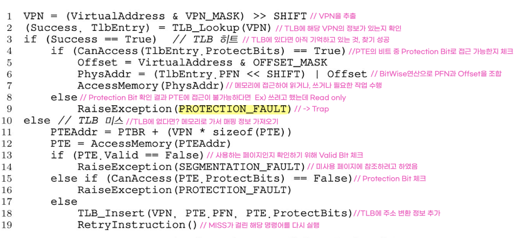 핵심 질문: 주소 변환 속도를 어떻게 향상할까? 🔹 흐름 정리 지난 블로깅에서 페이징 기법에 대해 알아보았다. 페이징은 프로세스 주소 공간을 작은 고정된 크기(page)로 나누고, 각 페이지의 실제 위치를 메모리에 저장한다. 매핑 정보를 저장하는 자료 구조를 페이지 테이블이라 한다. 매핑 정보 저장을 위해서는 더 큰 메모리 공간이 요구된다. 그런데 여기서 문제가 생겼었다. 가상 주소에서 물리 주소로의 주소 변환을 하려면 메모리에 존재하는 매핑 정보를 읽어야 한다. 모든 load/store 명령어 실행이 추가적인 메모리 읽기를 수반하는 것이다. 이 문제를 해결하기 위해서 하드웨어의 도움을 받는다. TLB에 대해 알아보자. 🔹 TLB란? TLB는 Translation-lookaside buffer의 약자로 ..